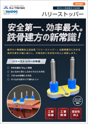 特徴 用途 規格サイズ 製品お問い合わせ 特徴 本体自重約3kgと軽量です。 払い込みと落とし込みどちらにも対応しています。 150mmの梁幅にも対応しています。 ネジ山が台形ネジで潰れにくい構造になっております。 用途 鉄骨建方における梁の仮接合 ラインナップ ハリーストッパー 規格サイズ 項目 ハリーストッパー 材質 ボルト・・・SCM440H ナット・・・S45C ボルト穴径(mm) 22/24兼用 締付可能寸法(mm) 12~95 図面 施工事例 商品紹介リーフレット お問い合わせ先 お問い合わせはお近くの事業所までご連絡下さい 拠点一覧を見る この製品についてのお問い合わせ 関連製品 建方資材 建方エース 建方ベース 親綱・緊張器