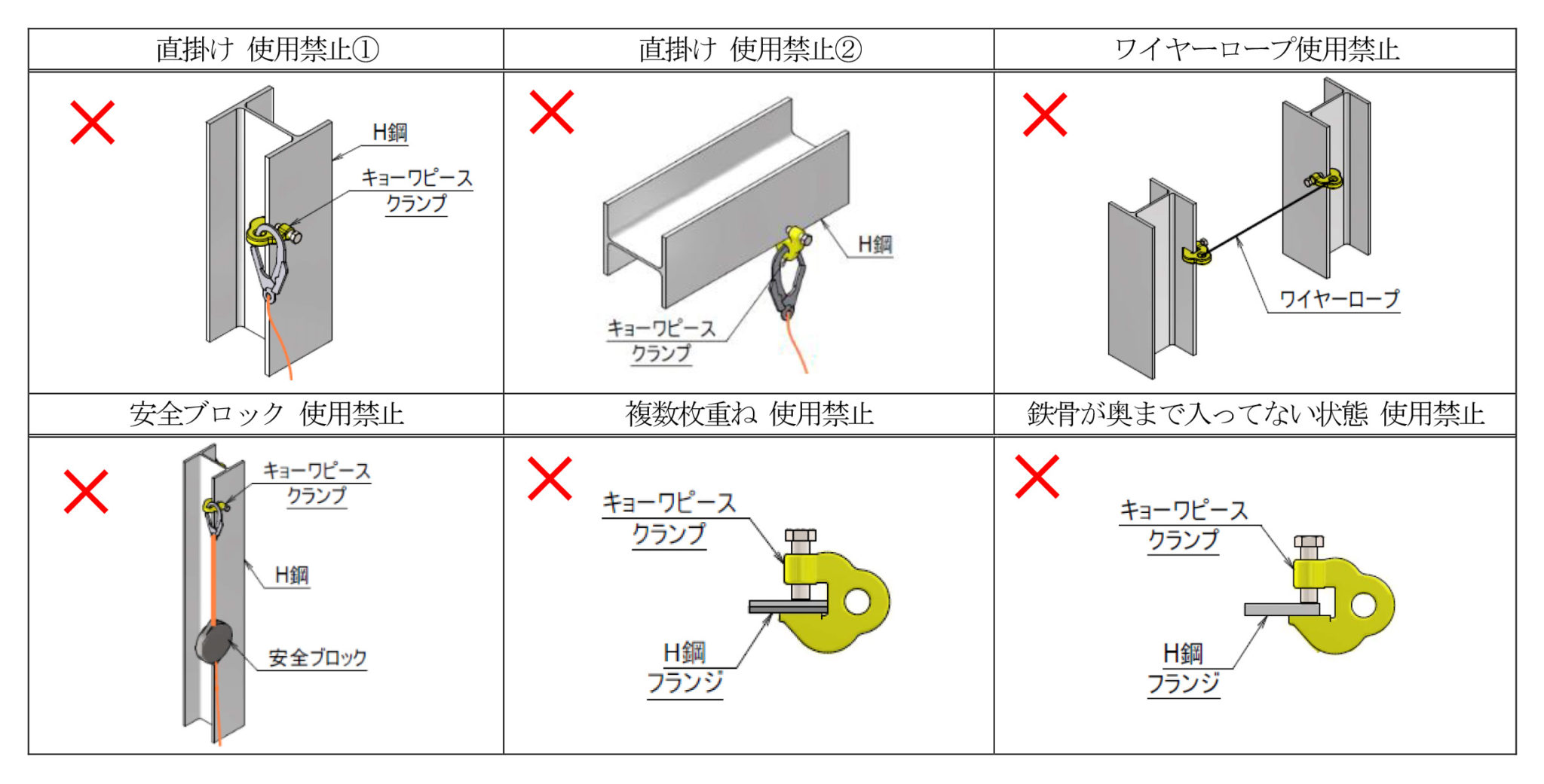 (1) 直掛け使用禁止:キョーワピースクランプへ墜落制止用器具のフックを直掛けしないでください。