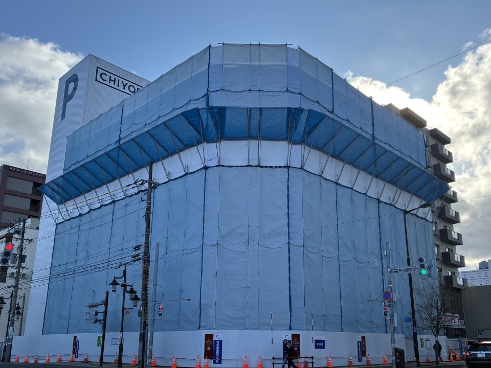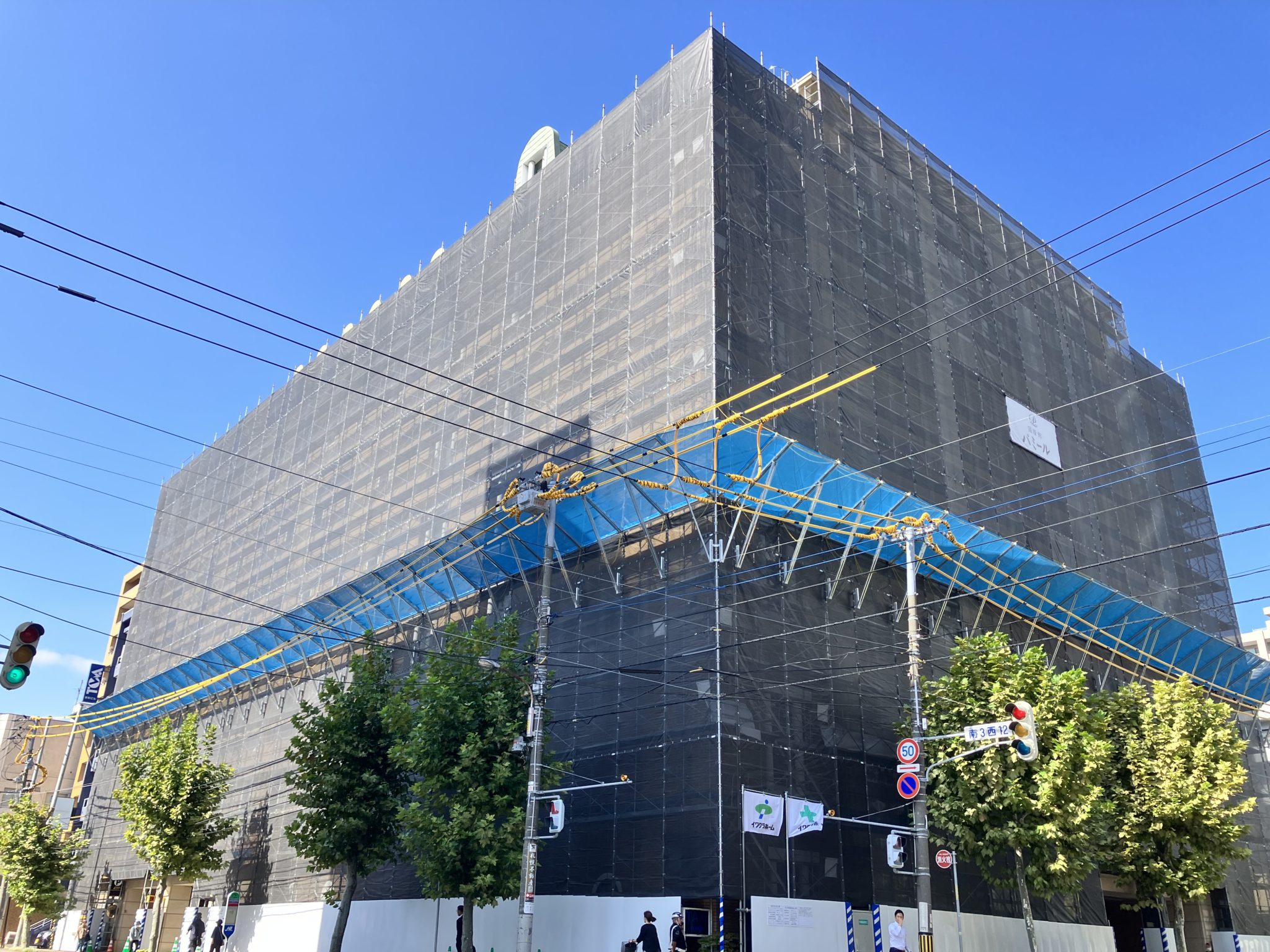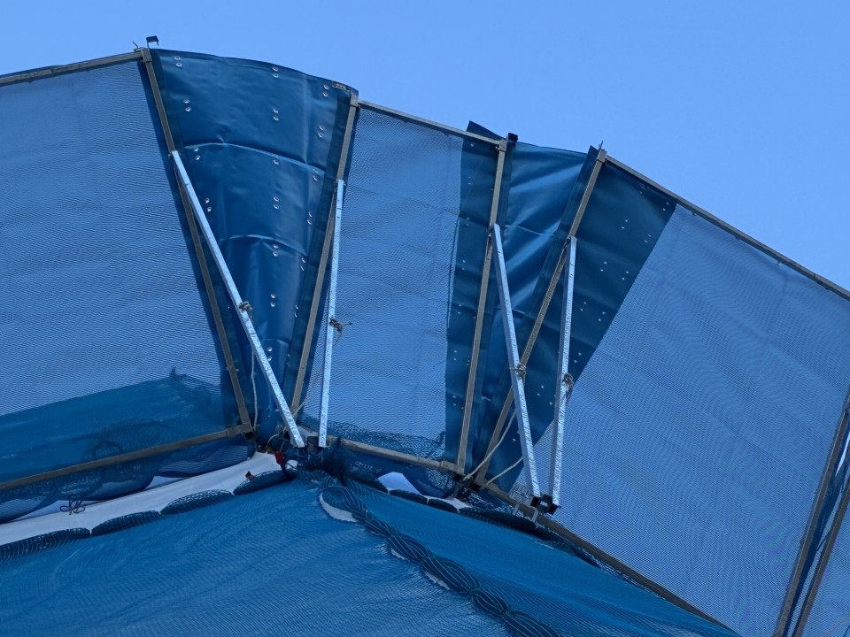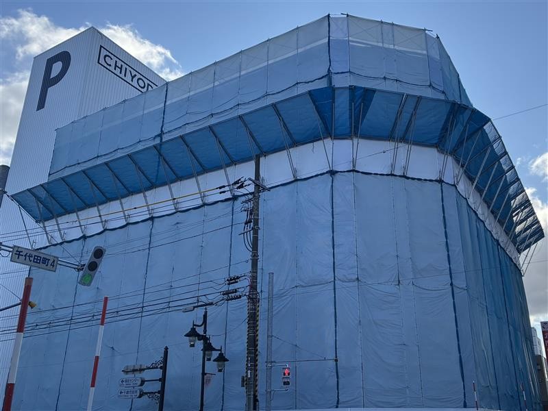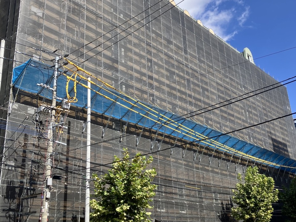 - 足場からの落下物が通行人などに危害を与えないようにするメッシュシートタイプの朝顔です。